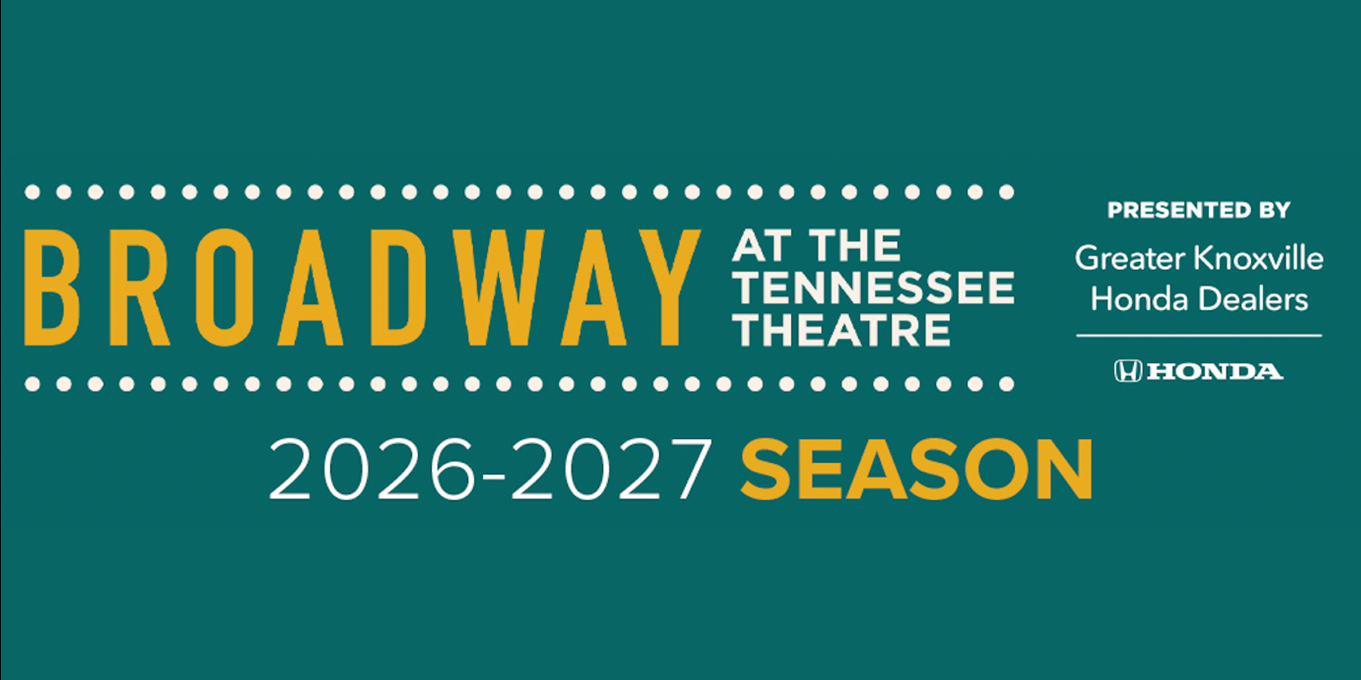 Broadway at the Tennessee is presented by Greater Knoxville Honda Dealers, with additional support from Visit Knoxville, Stowers Machinery Corporation, and Rather & Kittrell Capital Management.